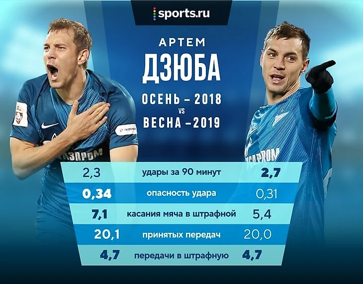 Разница между действиями Дзюбы осенью 2018-го и весной 2019-го действительно велика. Александр Дорский провел с Артемом блиц – сравнение статистики на позиции центрального нападающего и под Азмуном.