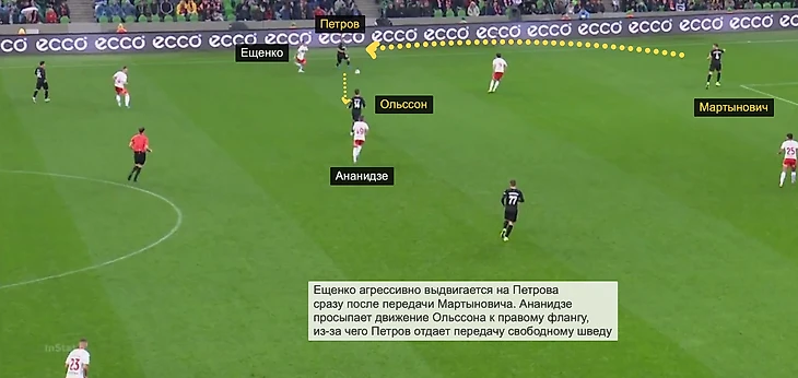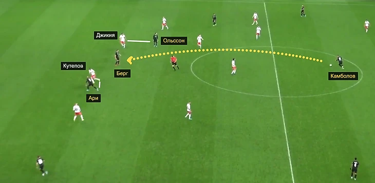 Когда «Спартак» встречал соперника ниже, тоже возникали проблемы – например, за счет выдвижения Ольссона вперед «Краснодар» получал ситуацию 3-в-2 в первой линии, и Камболов с Мартыновичем спокойно отдавали передачу на свободного игрока.