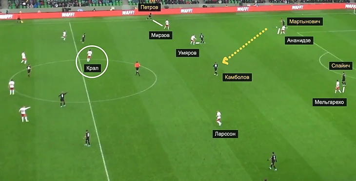 Во втором голе Крал тоже сыграл неудачно – слишком пассивно встречал Ари при выбросе Рамиреса из аута. В этом моменте точно нужно отметить и «Краснодар»: Берг ушел ближе к флангу и увел за собой Кутепова (так Ари оказался против профильного опорника на линии штрафной), а Шапи сместился в середину штрафной и забрал за собой Ещенко. Очень большие вопросы к Мирзову – даже с учетом грамотного расположения атакующих игроков «Краснодара» Петров не получил бы столько свободы, если бы Резиуан не проспал рывок защитника.
