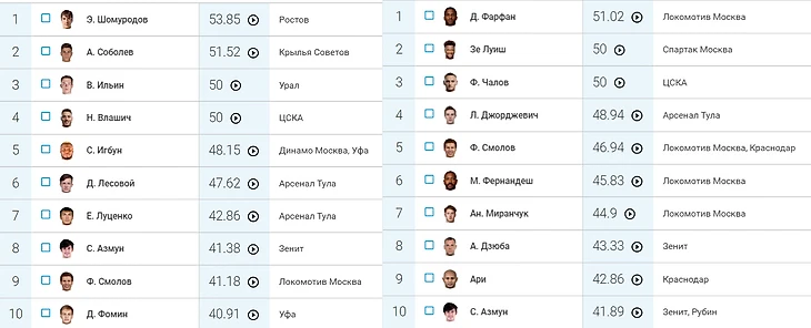 Самые точные игроки РПЛ в сезоне-2019/20 (слева) и сезоне-2018/19 (справа).