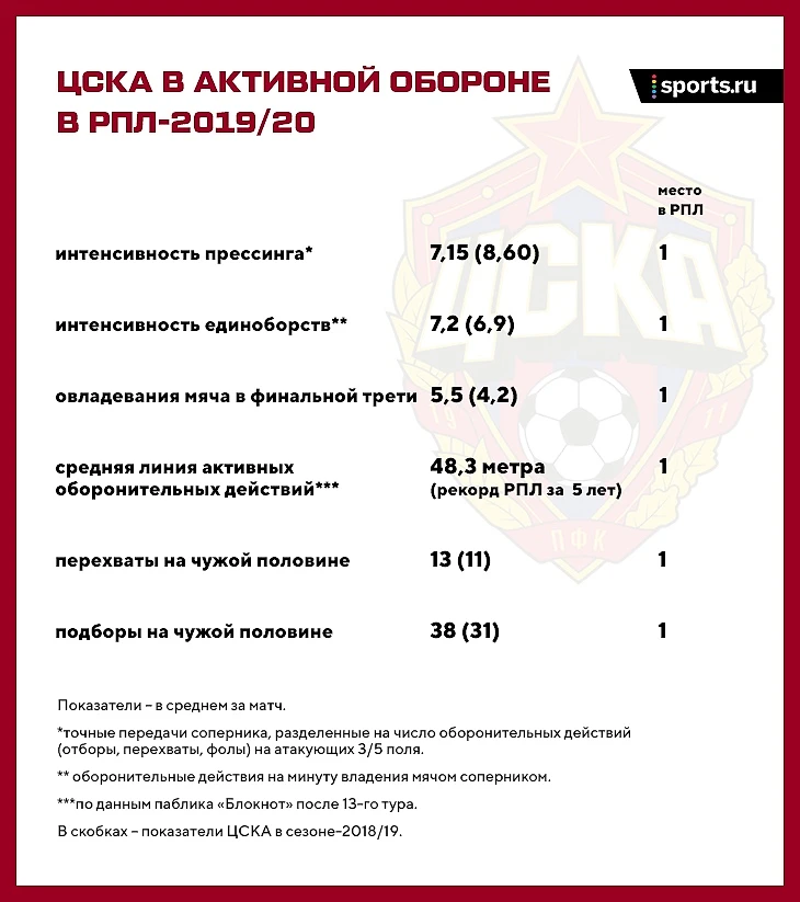 Агрессивный стиль сказывается на всех показателях ЦСКА в активной обороне – они не только серьезно прибавили по сравнению с сезоном-2018/19, но и с отрывом лучшие в РПЛ-2019/20.