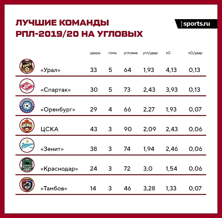 Еще один показатель, почему угловые ЦСКА не стоит переоценивать – голы команды Гончаренко после них. Против «Тамбова» Бистрович был первым на подборе (но удар получился фантастическим), а против «Ахмата» и «Урала» Чалов (почти всегда единственный, кто располагается во вратарской) и Магнуссон просто переигрывали оппонентов 1-в-1.