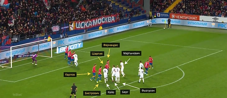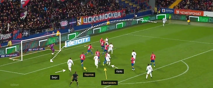 Скидка соперника на дальнюю штангу – грусть ЦСКА. Берг очень легко открылся из центра штрафной – Карпов в момент подачи за чем-то переключился на Кайо (за которого отвечал Бистрович), а затем стал играть по мячу.