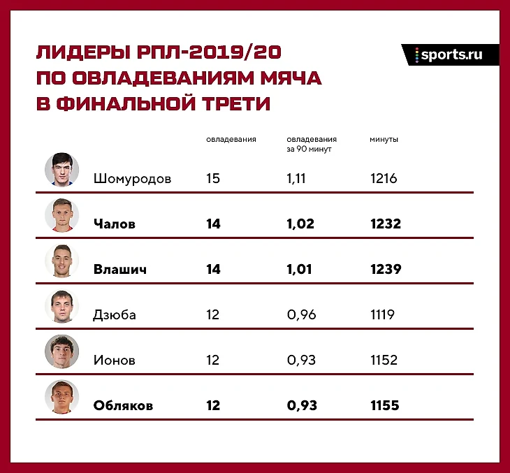 В топ-6 по числу овладеваний мяча (оборонительное действие, после которого мяч остался у команды, а не вернулся сопернику или ушел в аут) в финальной трети – три игрока ЦСКА.