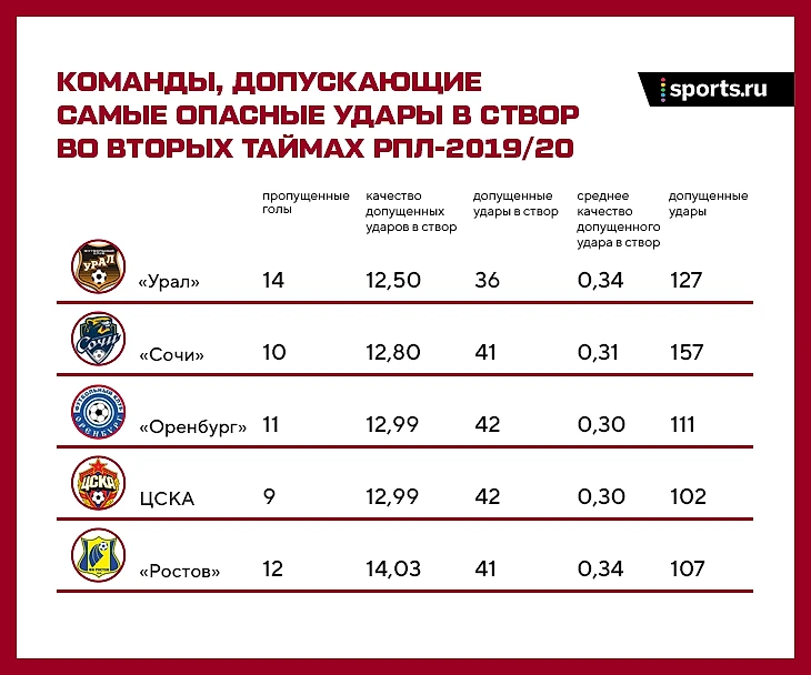 Дело точно не в физике – Гончаренко прав, говоря о том, что ЦСКА проваливает вторые таймы в целом, а не только концовки. В РПЛ после перерыва армейцы допустили 42 удара – столько же только у «Оренбурга».