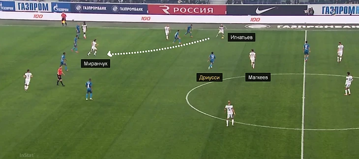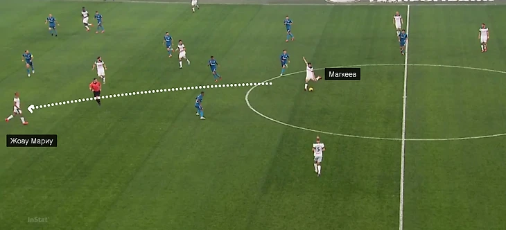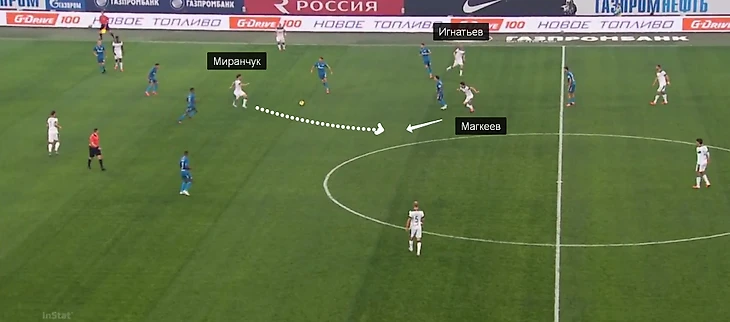 Самый крутой эпизод с Магкеевым на мяче случился в середине первого тайма – сначала Стас открылся под пас Игнатьева, разбивающий прессинг «Зенита» (для справедливости – очень неслаженный), затем выдал точный пас Эдеру, потом прекрасным движением ушел от Дриусси и открылся под передачу Миранчука, а в конце еще и выдал между линиями на Жоау Мариу.