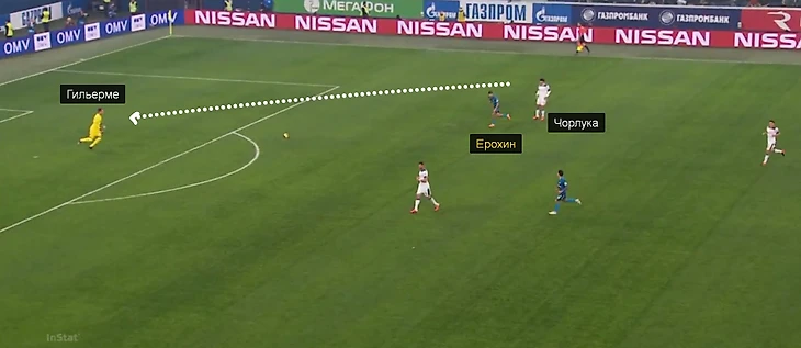 Еще одна незаметная функция Ерохина – уход в глубину при ударах Гильерме от ворот в первом тайме. Обычно Ерохин располагался между Магкеевым и Бариновым – и выиграл у них два верховых единоборства из трех.