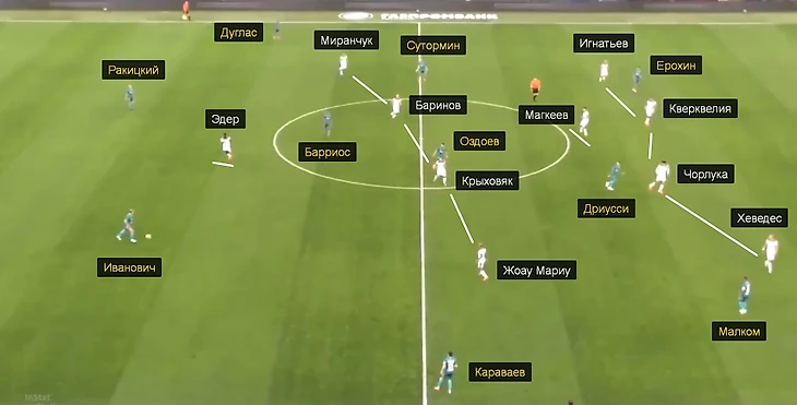 Кажется, что такое распределение нормально, но только если не знать характера других передач в штрафную – либо короткие в ноги, а не на пространство (исключение – пас Дугласа Сантоса на Дриусси, когда бразилец прорвался после стенки с Суторминым из-за недоработки Миранчука), либо вообще неудачный перевод на фланг (Барриос в конце тайма).