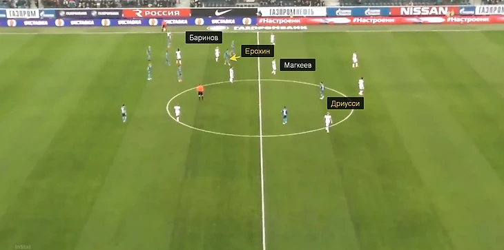 4. Вторая проблема «Зенита» – заполняемость опорной зоны соперника. Дриусси и Ерохин (особенно) активно сваливались на фланги, но по центру между линиями они ни разу не получили мяч за тайм. Ерохин в этой зоне вообще не сделал ни одного касания до перерыва, Дриусси – два. В одном случае аргентинец попал в офсайд, в другом – отдал проникающую передачу в штрафную в позиционной атаке, в которой «Зенит» довел мяч до финальной трети через фланг.