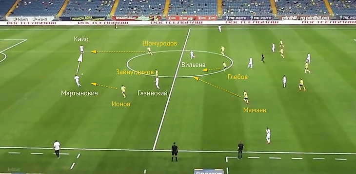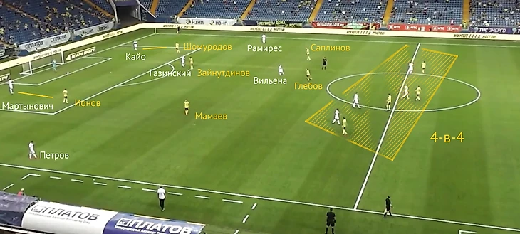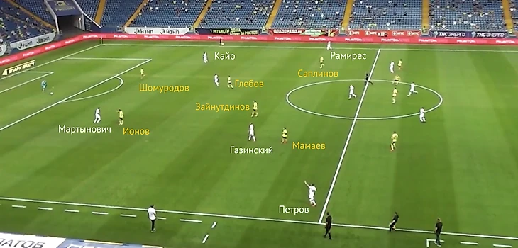 При поперечных передачах центральных защитников Глебов тоже оказывался очень высоко – чаще всего против Вильены. Узким расположением Мамаева и Саплинова, а также низкими позициями Байрамяна и Чернова «Ростов» освобождал фланги – Сафонов мог начинать атаку через переводы на Петрова или Рамиреса, но не рисковал (во время полета мяча Мамаев и Саплинов успевали бы переместиться в край).