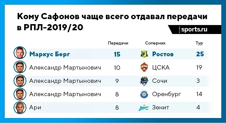 В итоге самым популярным адресатом передач у Сафонова стал Маркус Берг – 15. В этом сезоне вратарь «Краснодара» еще ни на кого не пасовал так часто (на Берга делал 3,1 передачи за 90 минут) – а общая таблица отлично характеризует стиль команды Мусаева.