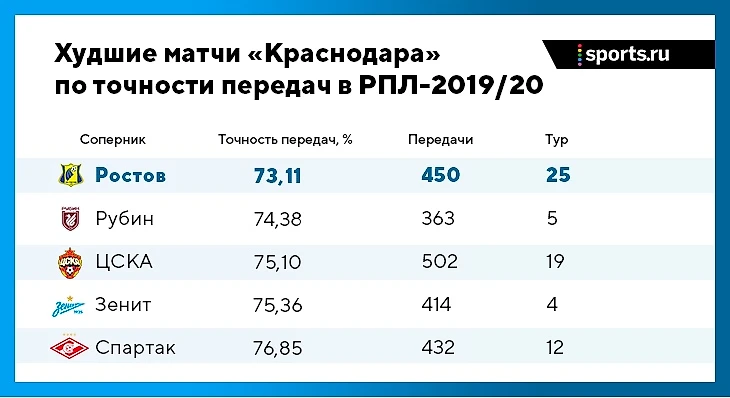 У «Краснодара» – худшая точность передач на своей половине поля (79,2%, против «Зенита» было 80,1%) и худшую точность всех пасов. Конечно, на такие результаты серьезно повлиял второй тайм, когда «Ростов» еще усилил давление, а краснодарцы устали – доля длинных передач у «Краснодара» возросла до 21,2%, а точность пасов упала до 68%.