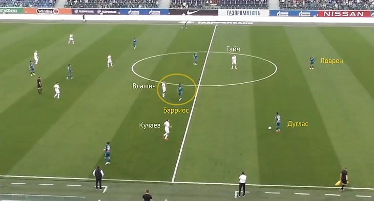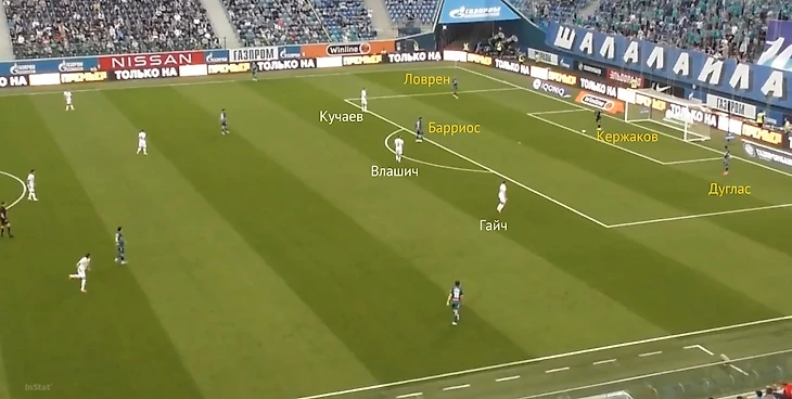 При этом у ЦСКА появилась интересная особенность при позиционной обороне – центральный нападающий (Чалов или Гайч) располагается не в середине тройки, а уходит в полуфланг. В игре с «Зенитом» Гайч чаще уходил вправо (игра по Дугласу Сантосу), Кучаев налево (по Ловрену), а в центре тройки оказывался Влашич, перекрывающий Барриоса.
