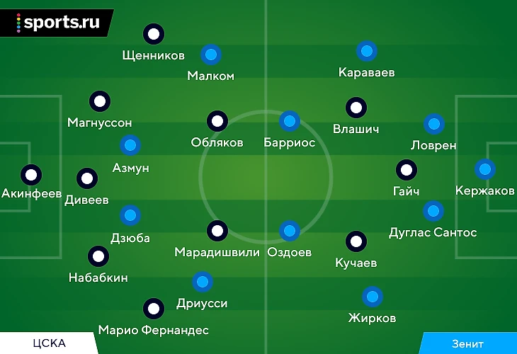 Конечно, гораздо важнее были потери – за тайм Марадишвили аж 3 раза отдал мяч игрокам «Зенита» (по разу – Азмуну, Дзюбе и Дриусси) не просто на своей половине поля, а близко к трети поля ЦСКА. К счастью, для гостей даже до удара «Зенит» довел только одну атаку – Малком пальнул выше ворот. Во втором случае Щенников накрыл готовящегося к удару Малкома, а в третьем Азмун отдал скрытую передачу на Дзюбу, которую Артем не ожидал.