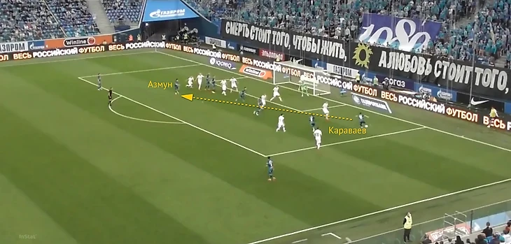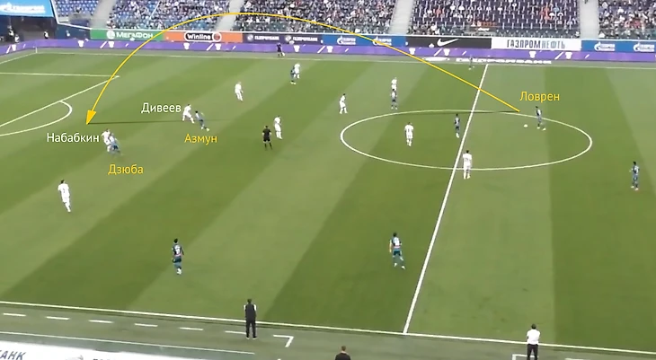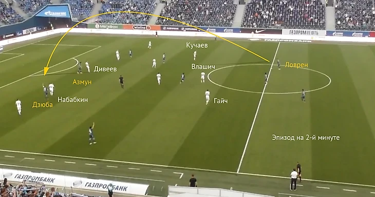 Первый гол «Зенита» тоже пришел после заброса на Дзюбу – его выполнил Ловрен. Расположение Артема при передаче хорвата абсолютно неслучайно – похожий эпизод случился еще в самом начале матча. Тогда Азмун открылся чуть назад – Дзюба выиграл борьбу у Набабкина, но скидка получилась не очень удобной.
