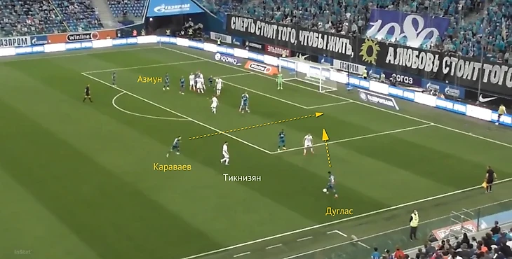 4. Отсутствие Ракицкого изменило типичный ход позиционных атак «Зенита». За весь матч Дуглас Сантос сделал всего 4 длинных передачи: 2 – заброс по левому флангу, 2 – пас в сторону нападающего в левый полуфланг. Первую проникающую передачу низом между линиями бразилец сделал только на 16-й минуте – и она оказалась неточной, а диагоналей на Караваева вообще не было.