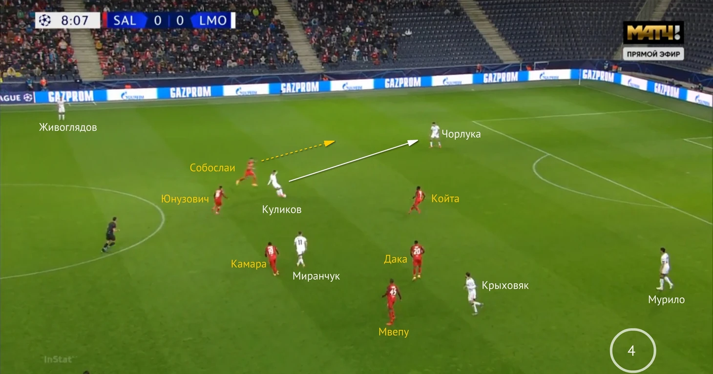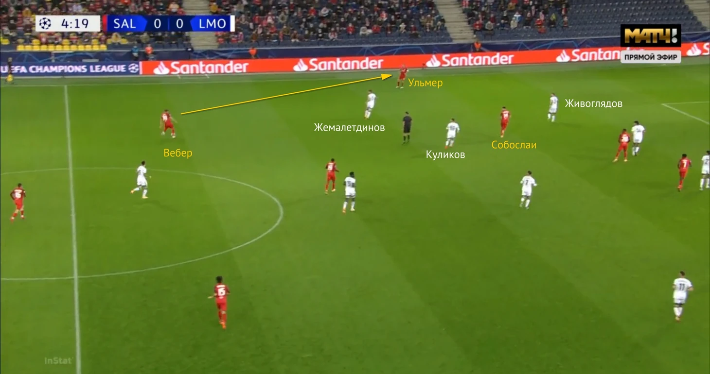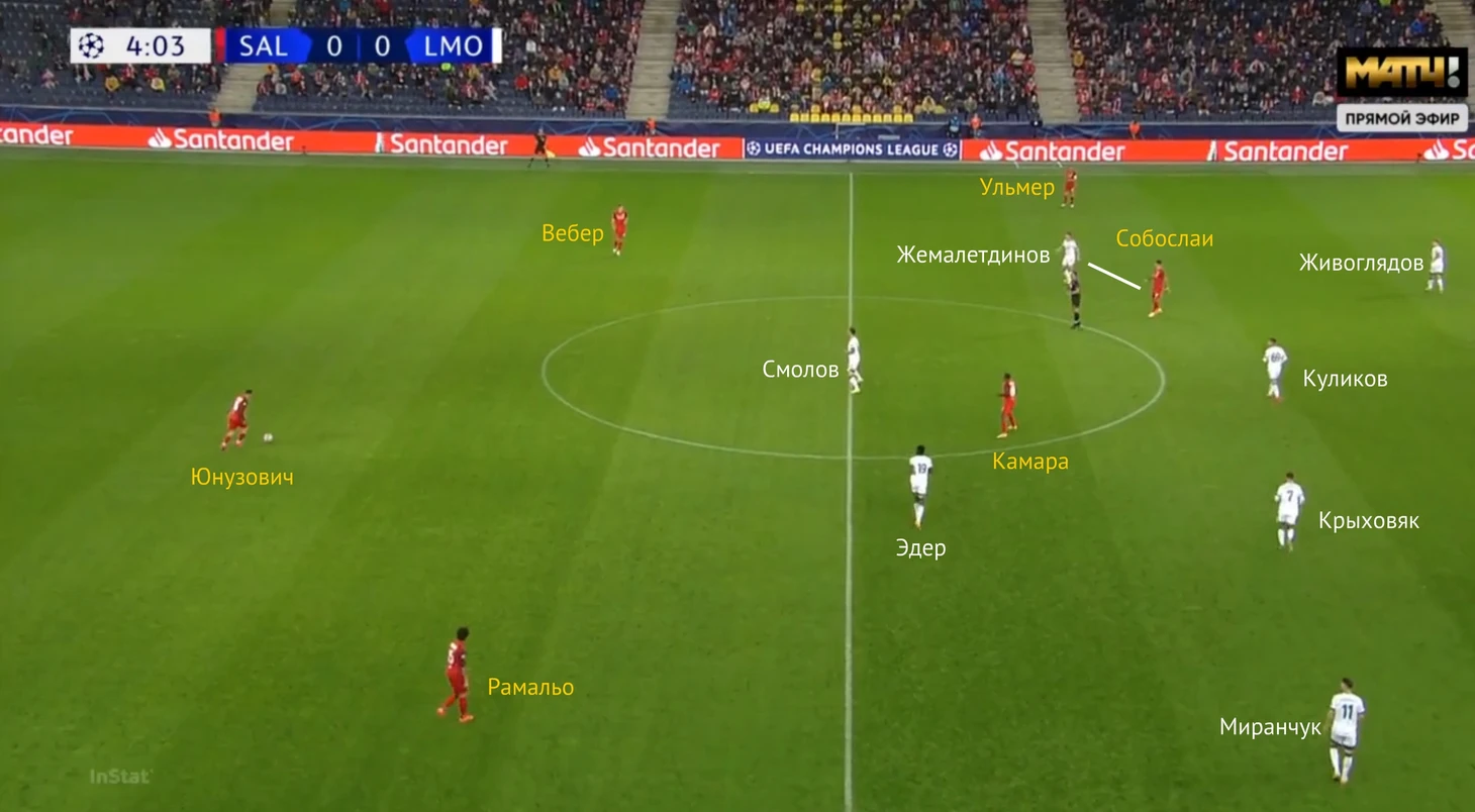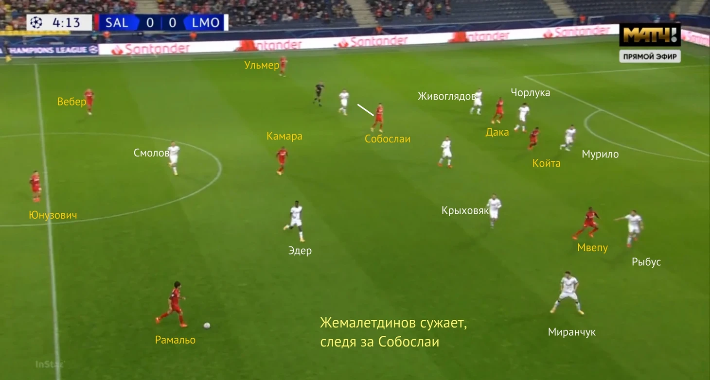 Инсайды «Зальцбурга» Мвепу и Собослаи располагались достаточно узко – у «Локомотива» была возможность выходить через Живоглядова и Рыбуса. Несколько комбинаций получились шикарными – чаще москвичи оказывались на чужой половине через край Живоглядова.