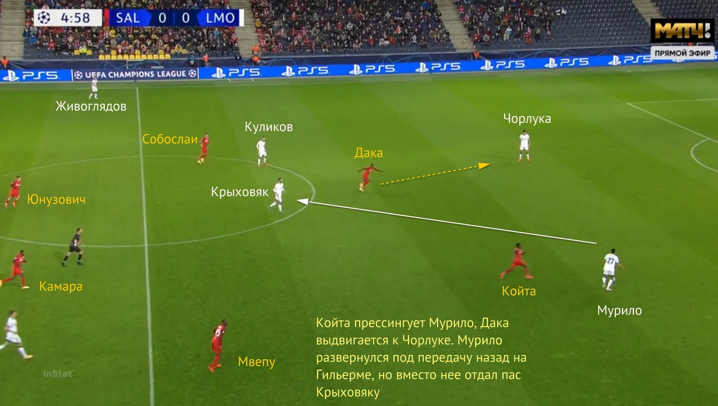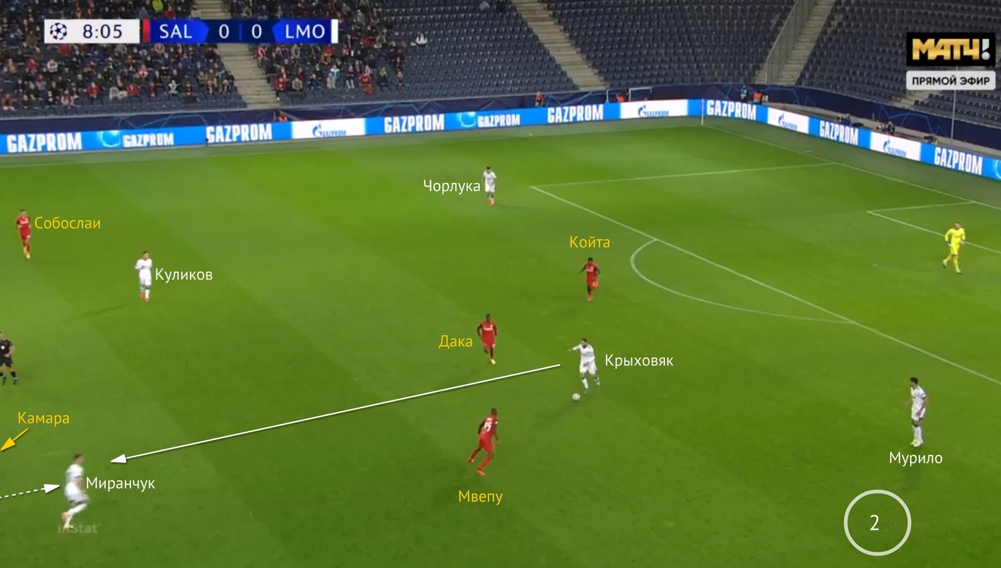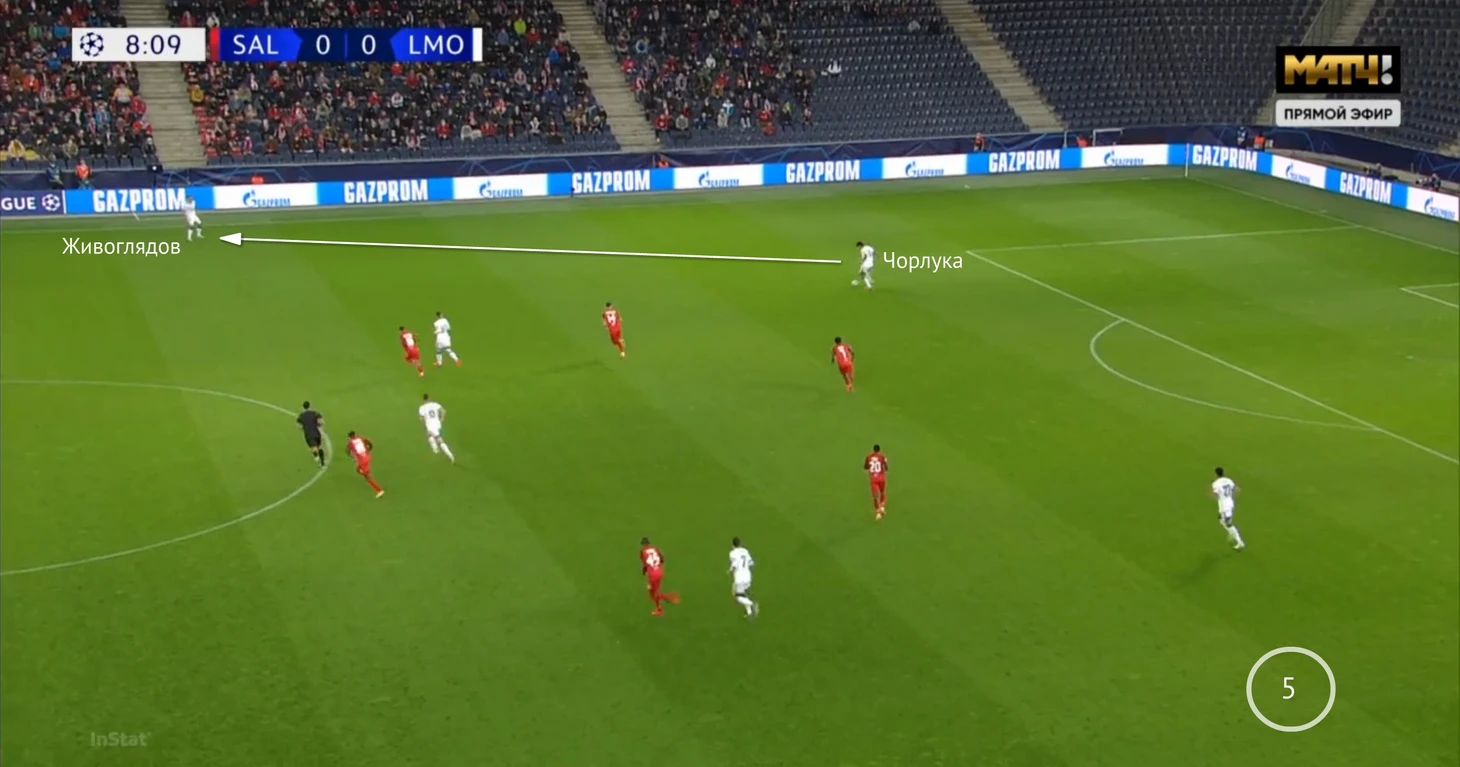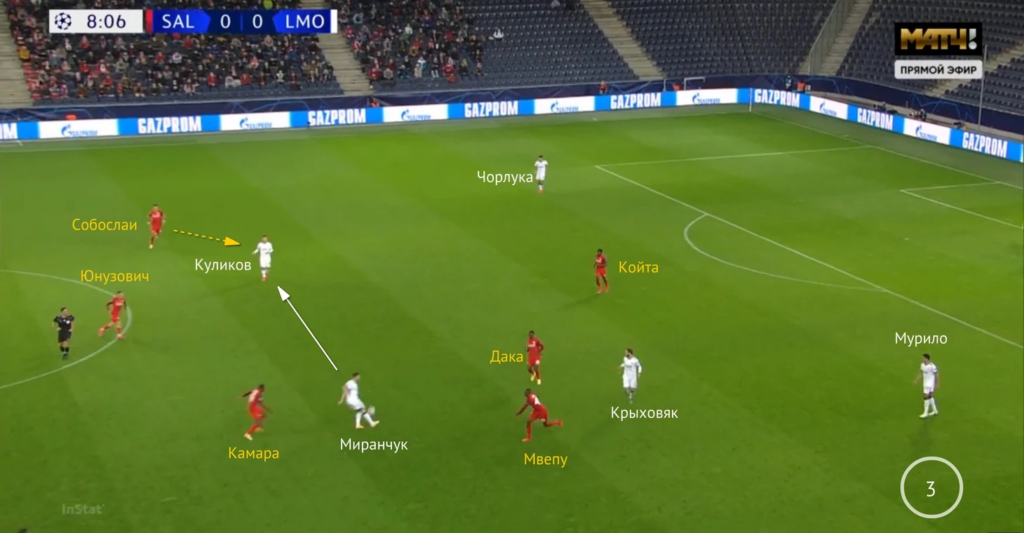 Инсайды «Зальцбурга» Мвепу и Собослаи располагались достаточно узко – у «Локомотива» была возможность выходить через Живоглядова и Рыбуса. Несколько комбинаций получились шикарными – чаще москвичи оказывались на чужой половине через край Живоглядова.