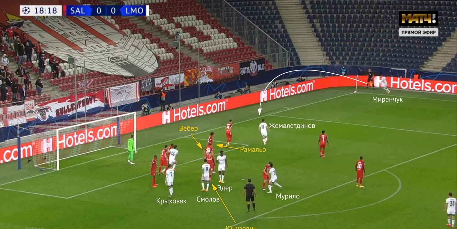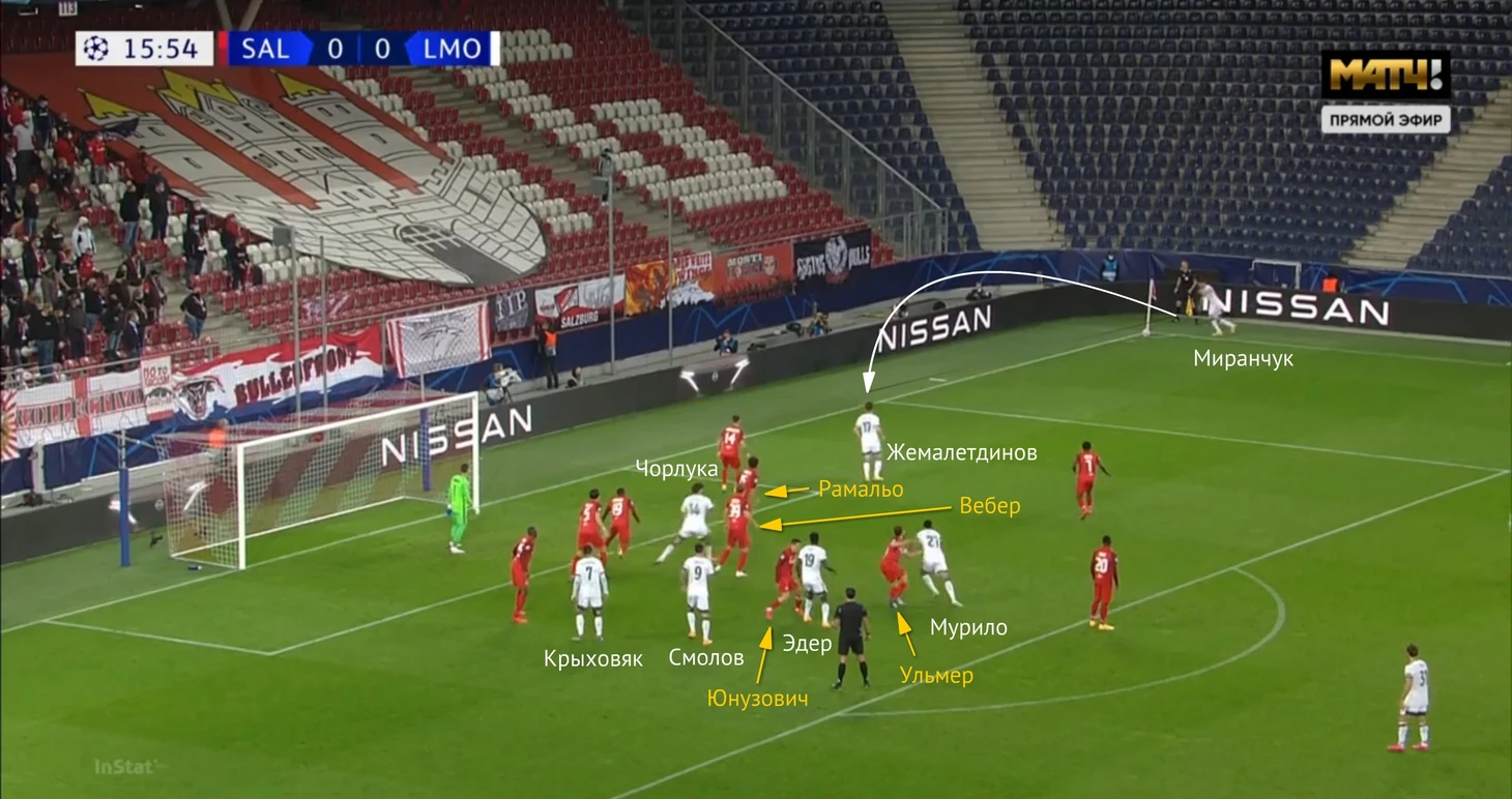 Расстановка «Зальцбурга» очень удивляет: по Эдеру и Мурило австрийцы играют персонально, но против бразильца действует левый защитник Ульмер, а по португальцу – вообще Юнузович (рост – 172 см). При этом персональная игра Юнузовича и игра центральных защитников в зоне (в этом матче – Рамальо и Вебера) – не новинка для «Зальцбурга». Например, в кубковом матче с «Санкт-Пельтеном» «Зальцбург» оставлял трех игроков на персоналку у линии штрафной – Юнузович был одним из них. При голевом угловом «Локо» расположение игроков не отличалось.