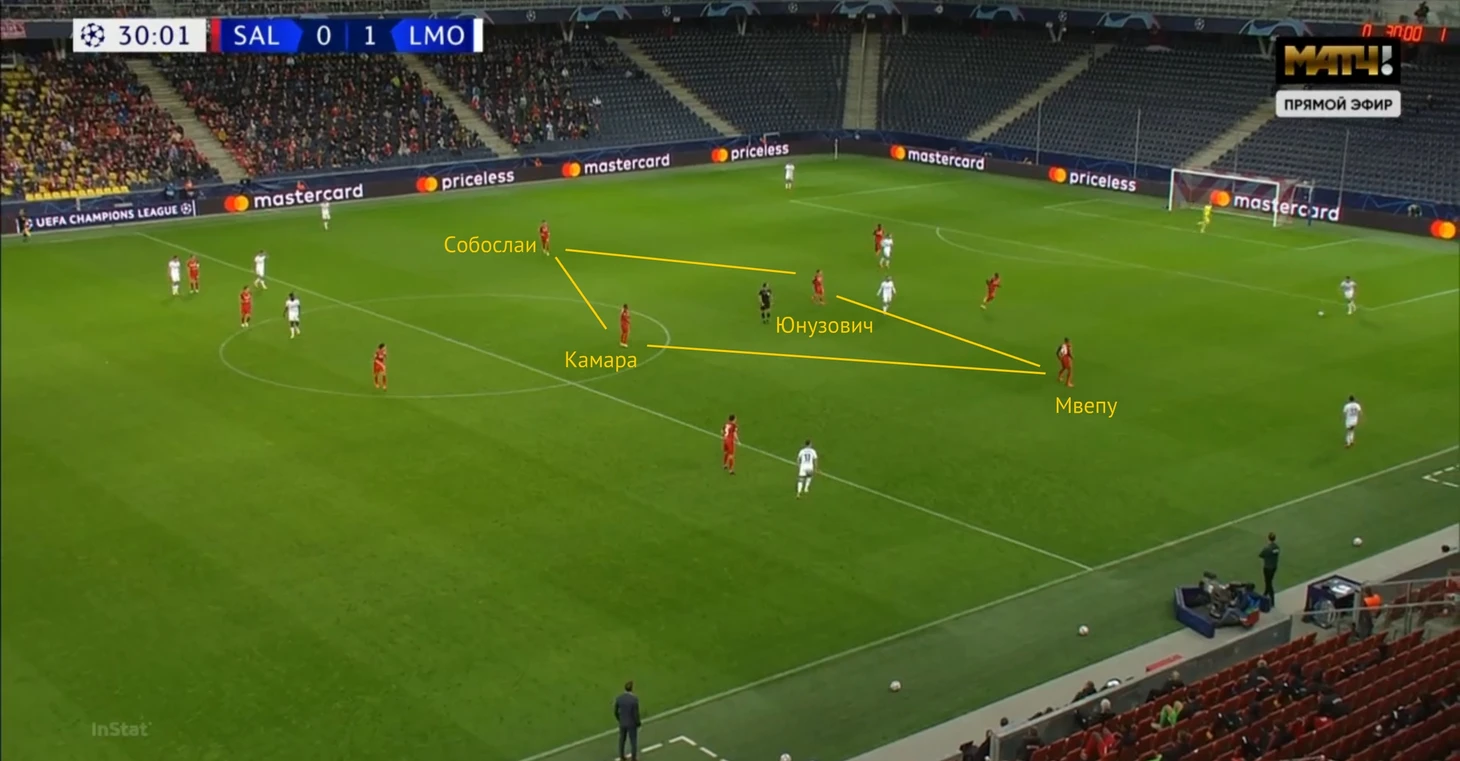 Фактически «Зальцбург» перешел на 4-4-2 ромб: Камара в качестве опорника, Мвепу – правого центрального полузащитника, Собослаи – левого центрального, Юнузович – десятки.