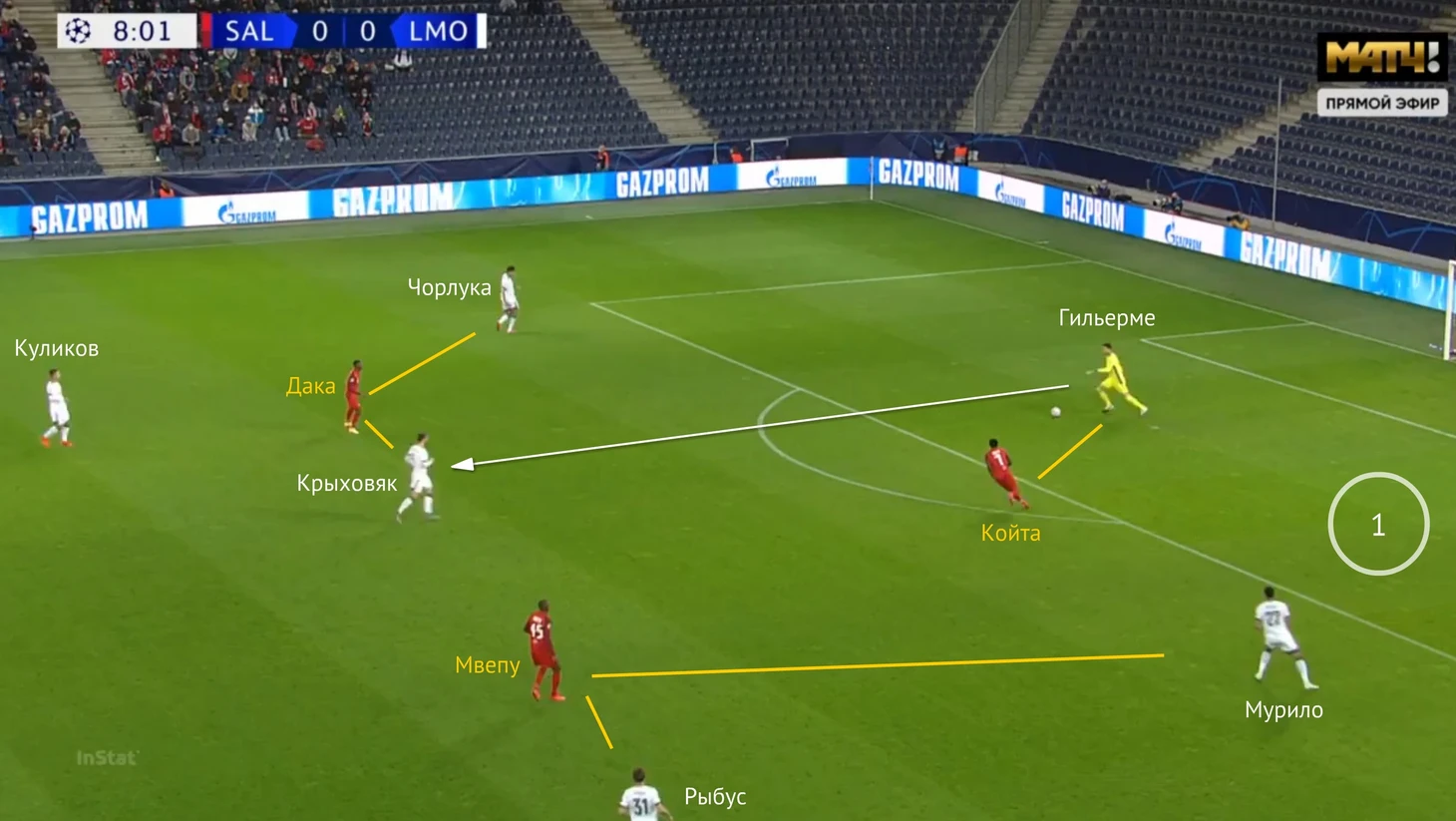 6. Единственная проблема «Локо» в первой половине тайма – кроссы от Ульмера с левого фланга. Туда «Зальцбург» достаточно просто доставлял мяч – помогала структура с тремя игрокам в первой линии при начале позиционной атаки.