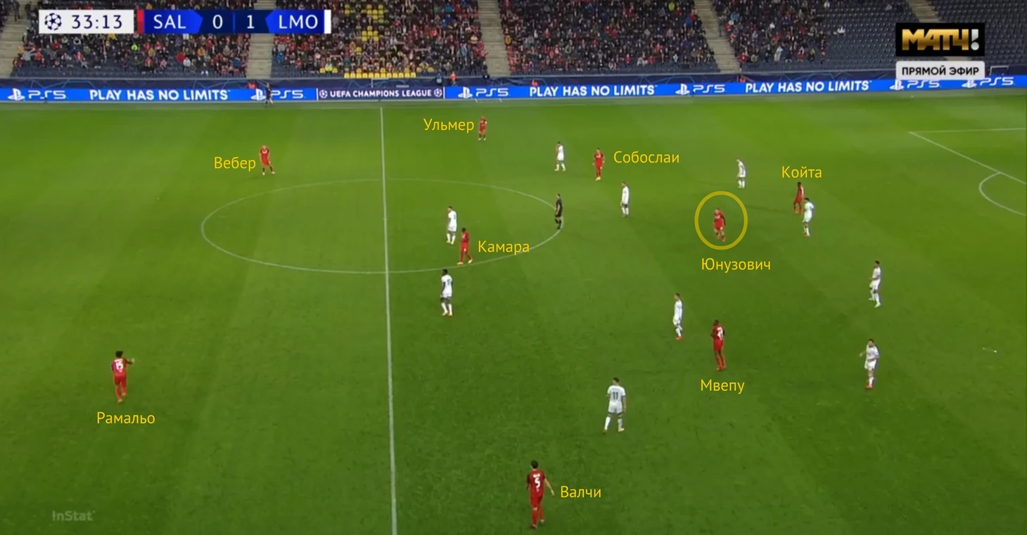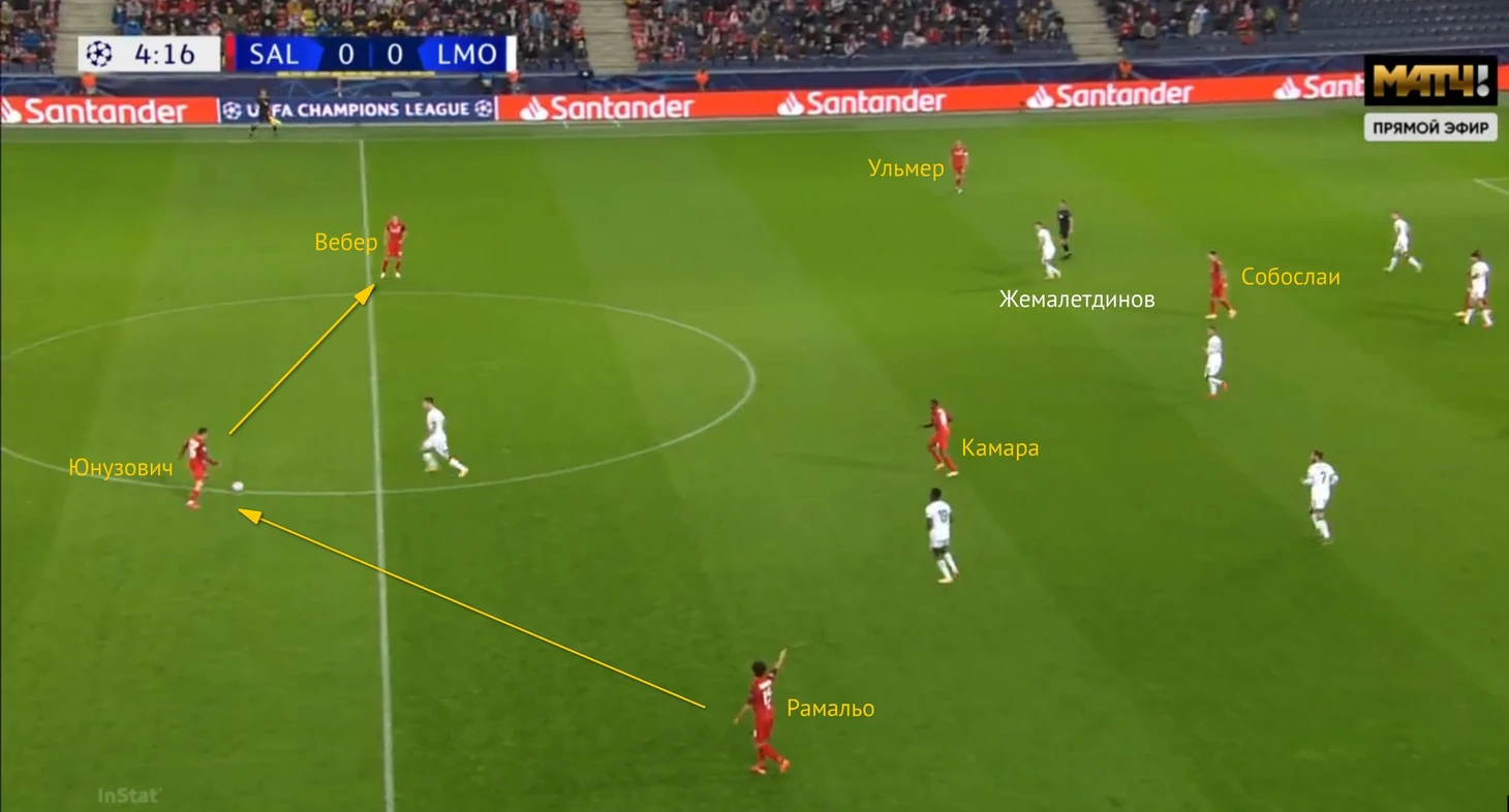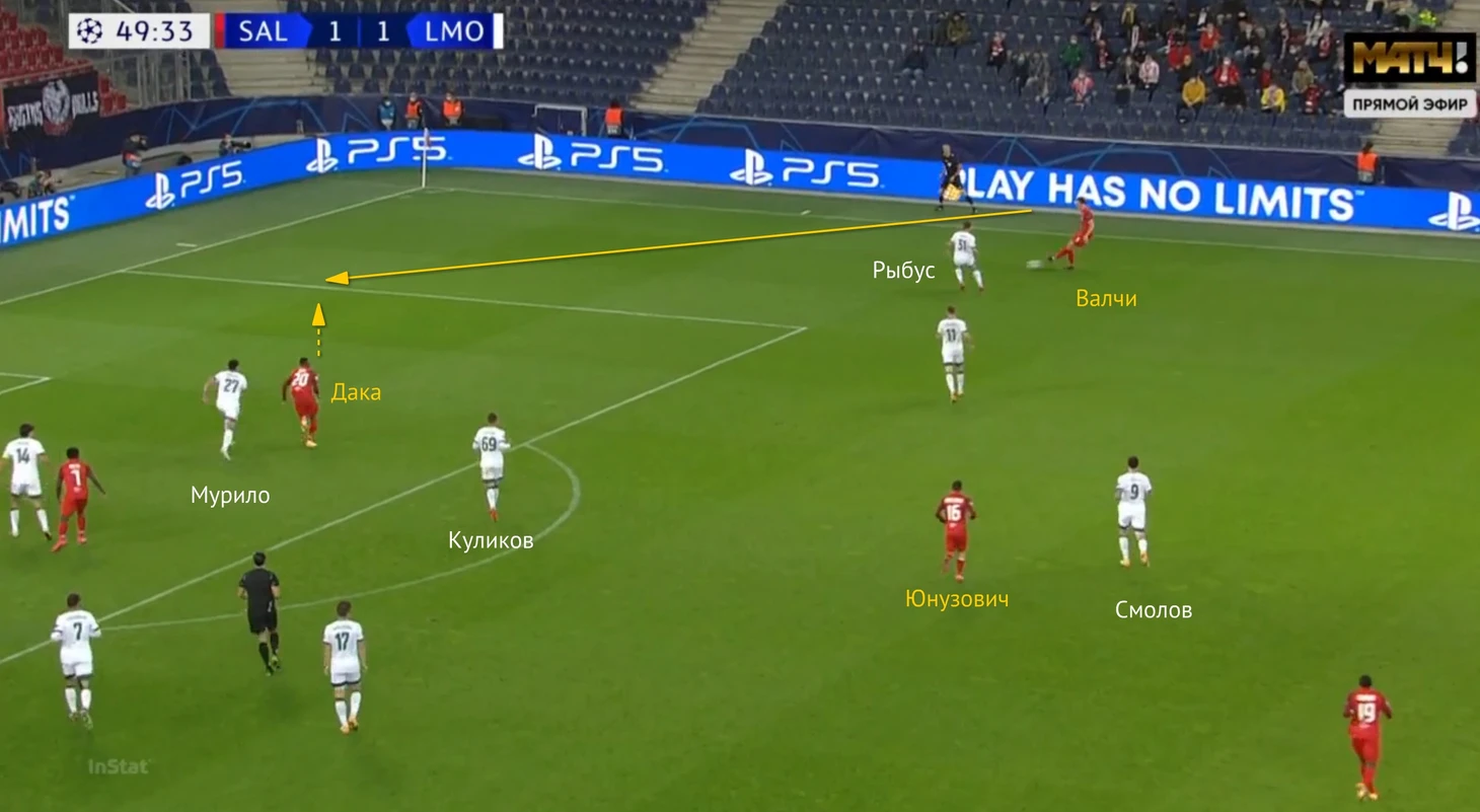 Юнузович до перерыва дважды классно открывался в опорной зоне «Локо» и получал там передачи – в первом случае заработал штрафной, во втором – пропустил на партнера, но глобально перемещение не принесло «Зальцбургу» пользы. После 28-й минуты до конца первого тайма австрийцы сделали всего 5 передач в штрафную «Локо» – при этом две из них были со штрафных, одна получилась неточным забросом (от самого Юнузовича), одна стала корявым тычком Даки, а последняя (Собослаи на Даку) родилась в контратаке. После смены схемы «Зальцбург» до перерыва не нанес ни одного удара из штрафной Гильерме, но австрийцев выручил стандарт.