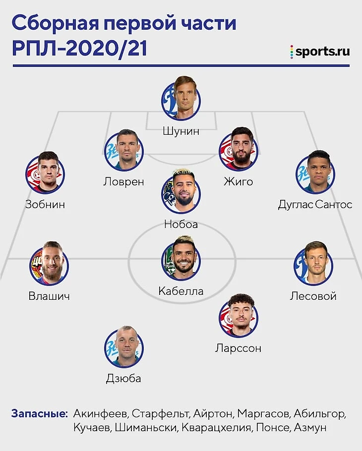 Сборная первой части РПЛ: Дзюба и Ларссон в атаке, Зобнин на фланге обороны и Шунин