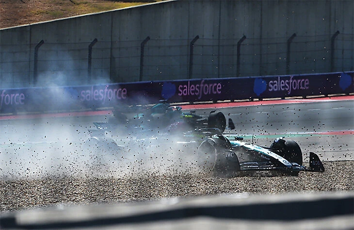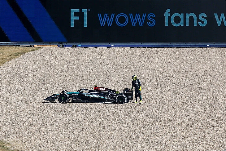 Перед всеми болидами со стартовой решетки возникли еще две проблема − одна известная по прошлым Гран-при на « трассе Америк», а другая новая. Первая − перепады температуры и сильный боковой ветер, который при проблемах с аэродинамикой просто сносит болиды за пределы трека – в этом месте они составляли до 40 км/ч, именно такой поймал и Расселл, а это сразу и единомоменто минус треть прижимной силы! Также предполагали возможные новые сбои в работе подвески (ведь один из тормозных ободов Льюису как раз поменяли перед стартом гонки) – любой сильный порыв ветра только нагнетает давление в потенциально проблемной детали и усиливает ее потенциальные неполадки.