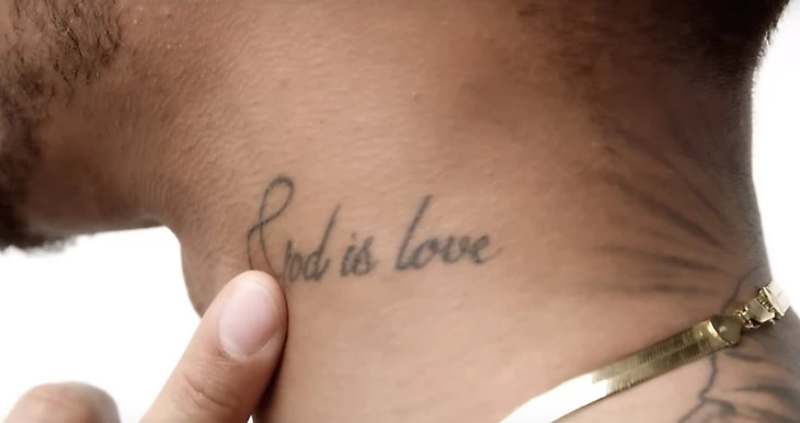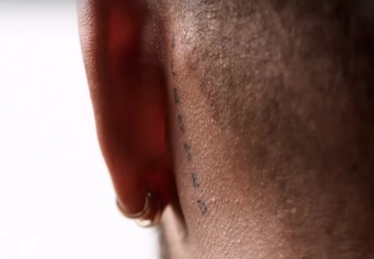 «Вот странный момент. «Благословленный» за моим ухом — сделал это просто потому, что хотелось набить куда-нибудь это слово, но я не знал, куда именно. И я решил «почему бы не туда?» В такие моменты всегда очень волнуешься, потому что понятия не имеешь, как все будет выглядеть».