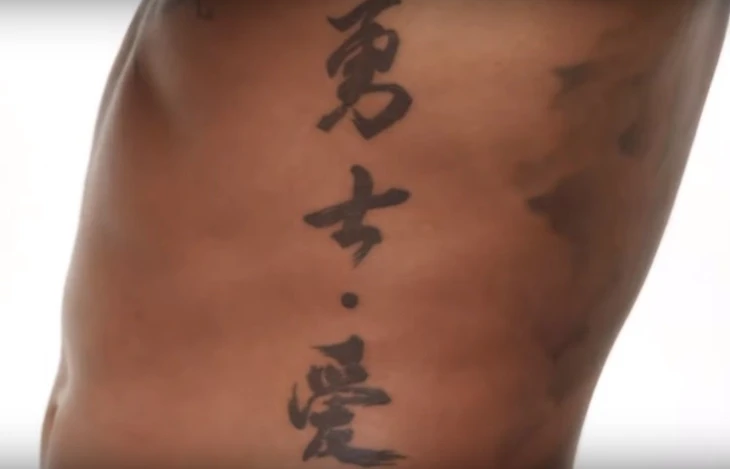 «Я приезжаю в Китай, когда мы гоняемся в Шанхае. Там шикарные фанаты. Так страстно приветствуют нас. Повсюду следуют за нами, постоянно дарят подарки — они очень щедрые. Прекрасные люди. Так что однажды я решил, что хочу китайский символ, и выбрал «воина», потому что таковым себя считаю, «любовь» и «все окружающее».