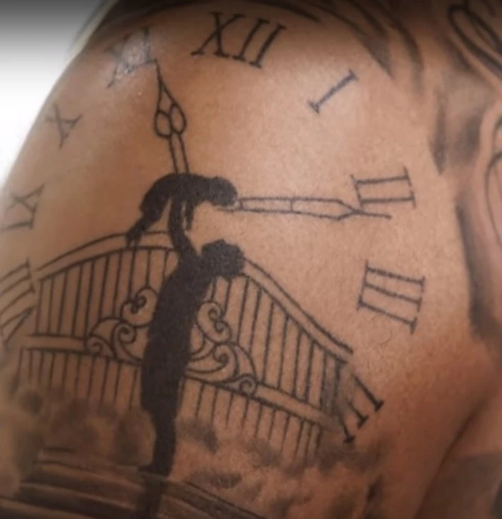 «Последняя на данный момент — на моем плече. Она посвящена отцу. Без него я бы не занимался тем, что делаю сейчас. Он был отличным отцом и фундаментальной фигурой, образцом для меня. Помню, когда мне было четыре, он меня так подбрасывал — как обычно делают с детьми. И это самый яркий образ, связанный с отцом. Он очень серьезный и строгий человек. Но в том конкретном моменте он выглядел счастливейшим человеком. Не было никаких дел, не требовалось никакой дисциплины — лишь чистая любовь. Еще я набил часы, потому что это очень особенной момент. Здесь он держит меня на ступенях к Жемчужным Вратам [библейские врата Рая]».