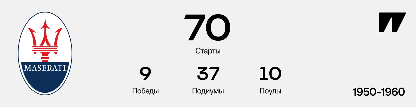 Благодаря Хуану-Мануэлю Фанхио и Стирлингу Моссу «Мазерати» одержала 9 побед, а аргентинец стал двукратным чемпионом мира, причем последняя личная победа стала для него пятой. Добыл он ее в приличном возрасте – 46 лет, за рулем культового «Мазерати» 250F. Машина отличалась надежностью и универсальностью, несмотря на финансовые трудности у производителя.