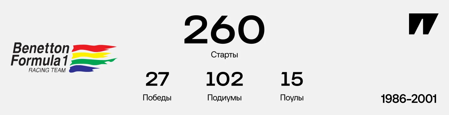 В начале 80-х «Бенеттон» − известный производитель одежды, зашел в «Ф-1» в качестве спонсора. В 1986-м выкупил «Тоулмен» и обрел собственную команду.
