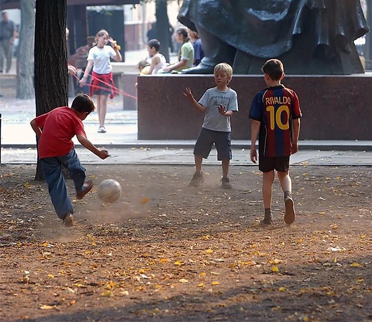 Помнится, мы играли на дороге любым мячом (будь то баскетбольный или волейбольный). Дорога была длинная, и специально выбирали то место, где находились дома, в которых жили добрые люди и отдавали мячи, когда залетало в их двор (а залетало каждые 15 минут). А ворота были естественно из камней, которые каждые 2-3 минуты надо было убирать, чтобы проехала машина, а еще все время проходили прохожие и приходились ждать, пока они уйдут с поля битвы. В итоге из трех часов игры сам футбол длился 40% времени и это было круто, такое детство было. Сейчас я по закону должен был сказать, что нынешняя молодежь сидит дома в интернете, но нет. Так, как мы живем в пригороде, то у нас во дворе все так же, все так же играют в футбол на дворе: камни, волейбольный мяч, мешающие машины и пешеходы. Все это есть!