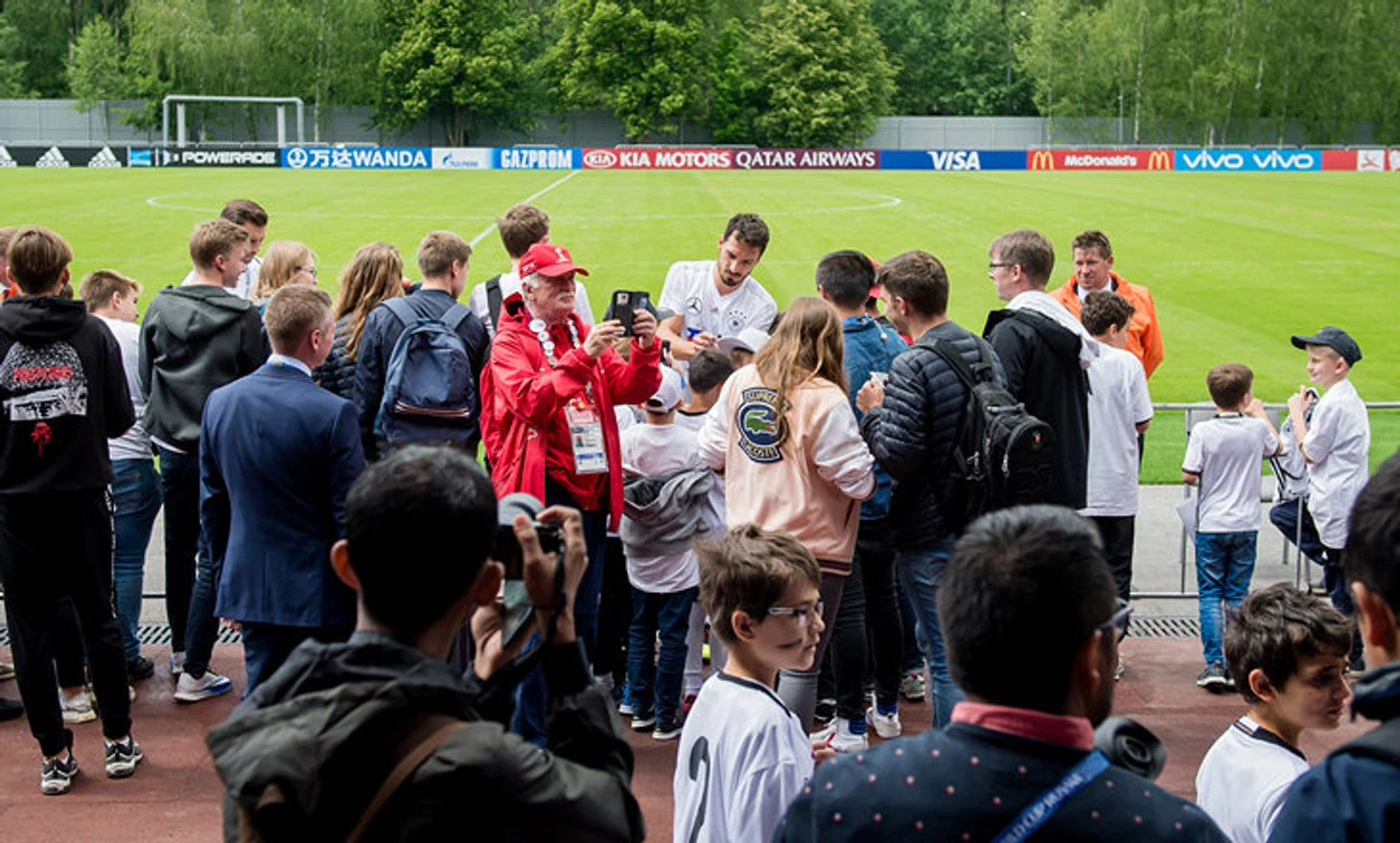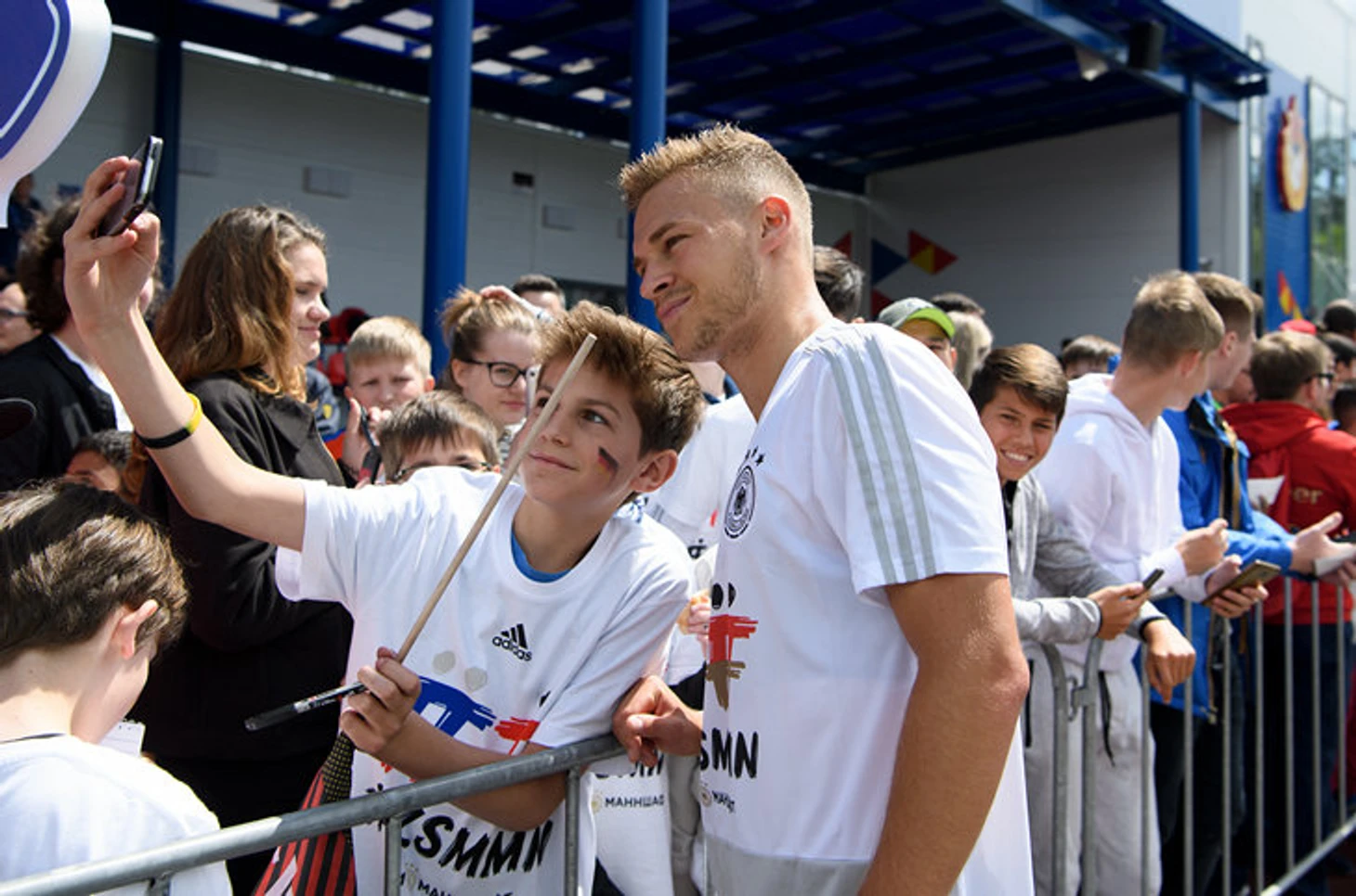 На второй день в России сборная Германии провела открытую тренировку в Ватутинках и собрала аншлаг. Но перед ее началом парни подарили детям 1000 футбольных мячей.