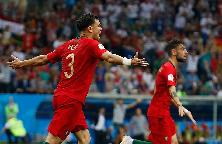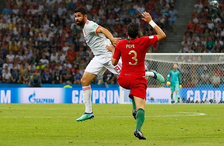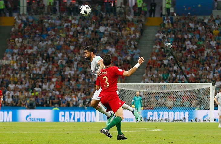 Испанский форвард Диего Коста боролся за верховой мяч с Пепе и врезал тому локтем в челюсть.