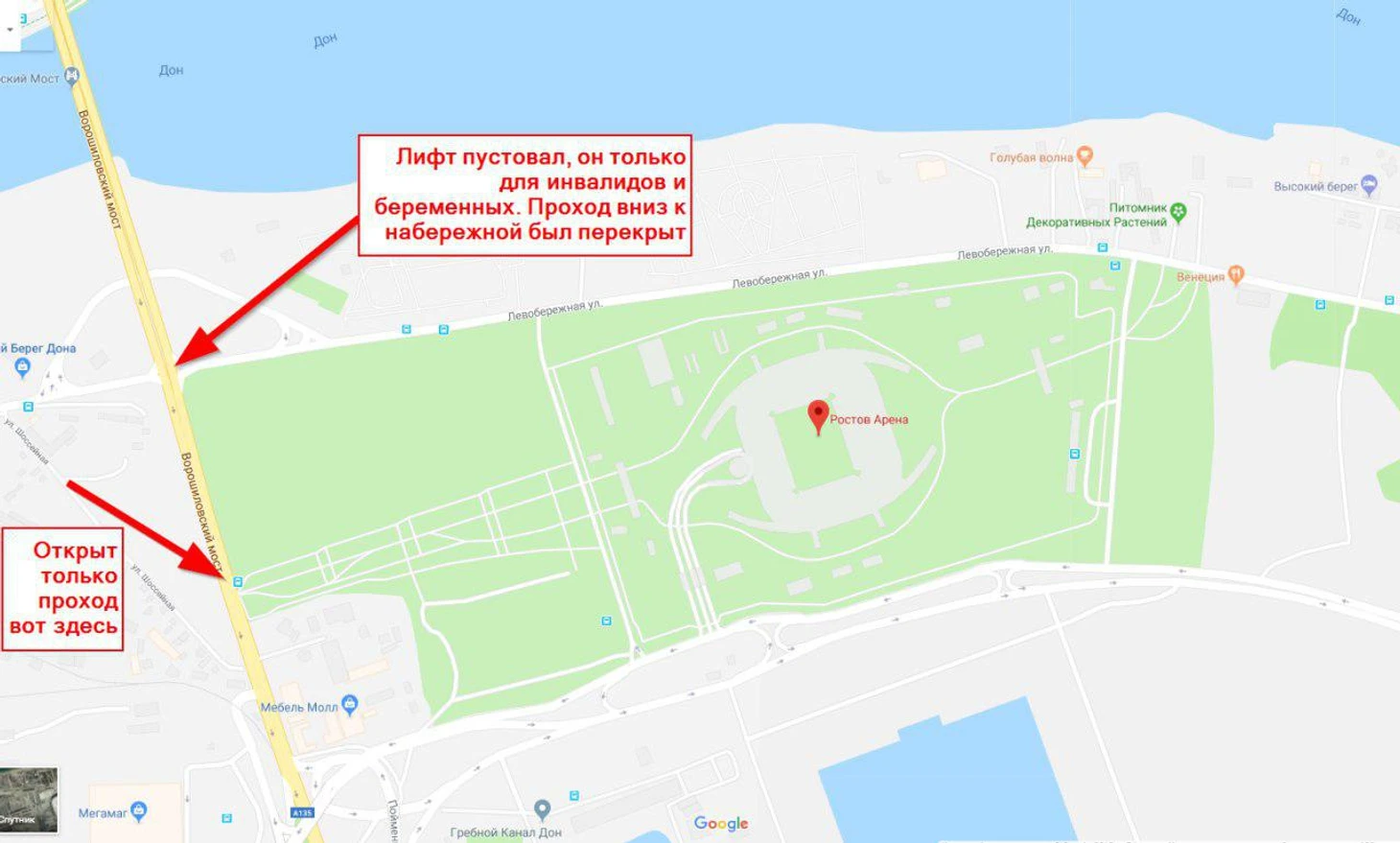 Матч начинался днем, на улице было +33, тени нет, но дорогая полиция не дремала. Сюрпризы начались еще на мосту возле стадиона. На пустующем лифте спуститься могли только беременные и инвалиды, а воспользоваться лестницей, которая вела со стадиона на набережную, не мог вообще никто. Разрешалось идти напрямую на центральную аллею стадиона.