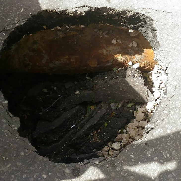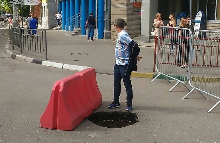 На самом деле, ямой это назвать сложно: на перекрестке образовался полноценный провал асфальта. От обычной выбоины на дороге ее отличает глубина: судя по фотографиям, в дыру легко помещалась пара болельщиков, так что асфальт провалился как минимум на полметра.