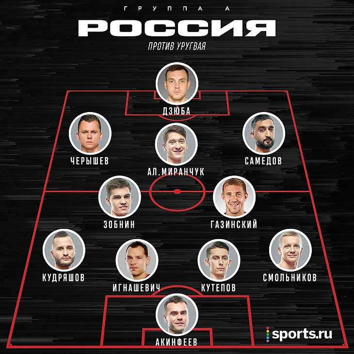 15:41 Стартовый состав сборной на матч с Уругваем. У Жиркова травма, Головина берегут от второй желтой карточки, Фернандес отдыхает, а вместо Смолова Дзюбиньо.