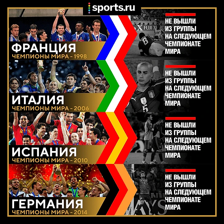 Начиная с французов, победивших на ЧМ-1998, чемпионы мира проваливают следующий турнир. Но это правило работает только на европейские сборные. Бразильцы, выигравшие в 2002-м, на следующем ЧМ дошли до 1/4 финала.