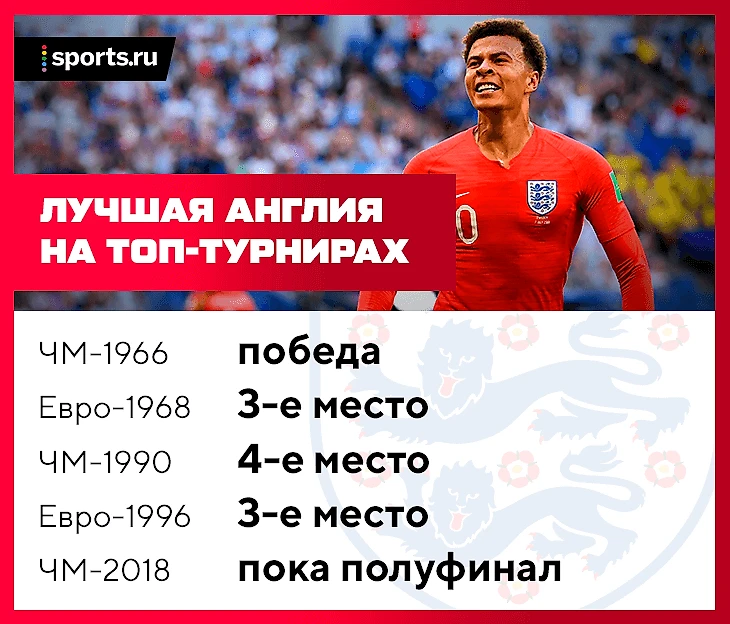 • Теперь у англичан гарантированно будет медальный матч – ровно тогда, когда их перестали считать элитной командой даже по инерции. Хотя инерция была сильнейшей; этот полуфинал – лишь 5-й для Англии на больших турнирах, с наградами все тоже совсем скромно.