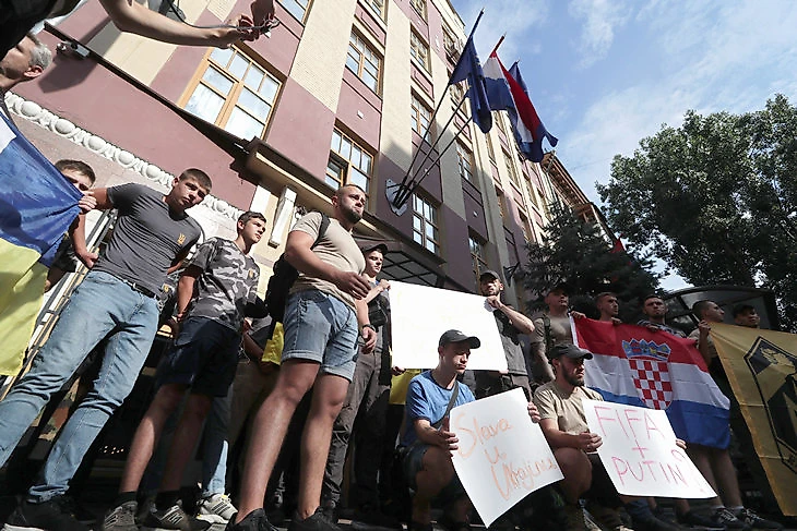 • Во вторник около хорватского посольства в Киеве прошла акция в поддержку Виды и Вукоевича. Там собрались несколько десятков активистов организаций «Ветеранское братство» и «Национальная дружина». Участники акции развернули флаги Украины и Хорватии, еще встречались баннеры про ФИФА. Например: «ФИФА+Путин?».