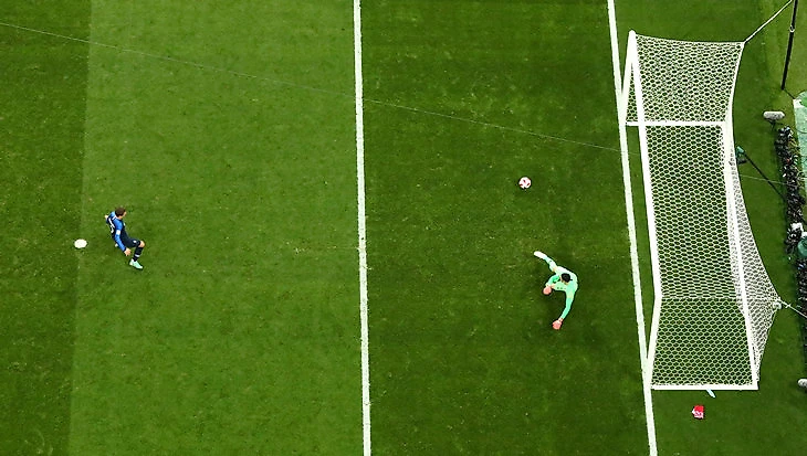 Причем нырял Гризманн в этой точке неспроста. Примерно с этой же точки он отдал голевую со стандарта в матче Франция-Уругвай. Явно натренированно и удобно под левую ногу, посему победа французов с небольшим, но запашком.