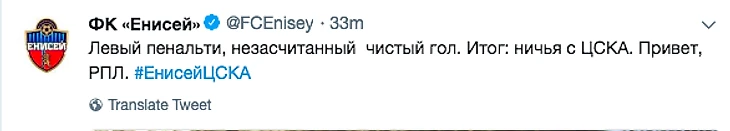Незадолго до этого Артур Саркисов забил второй гол в ворота ЦСКА, но его не засчитали (судьи решили, что был офсайд). Официальный твиттер «Енисея» отреагировал на это так: «Левый пенальти, незасчитанный чистый гол. Итог: ничья с ЦСКА. Привет, РПЛ».