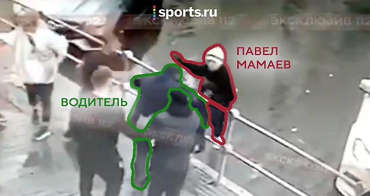 • 0.44 – Водитель отталкивает/бьет Кокорина-младшего – тот падает. В дело возвращается Мамаев, к нему подключается остальная компания. Водитель лежит, его избивают пять человек, в том числе и Александр Кокорин.
