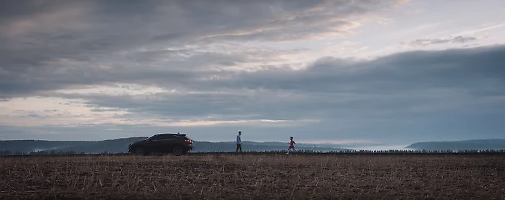• Парень сбегает из подвала. Бежит по дороге в поле за машиной.