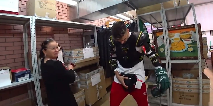 Жеке дали клюшку, джерси с номером 99 (как у Грецки) и отправили на фотосъемку – все серьезно. После фото была заточка коньков и знакомство с одноклубниками. Данис Зарипов даже помог начинающему хоккеисту замотать клюшку: