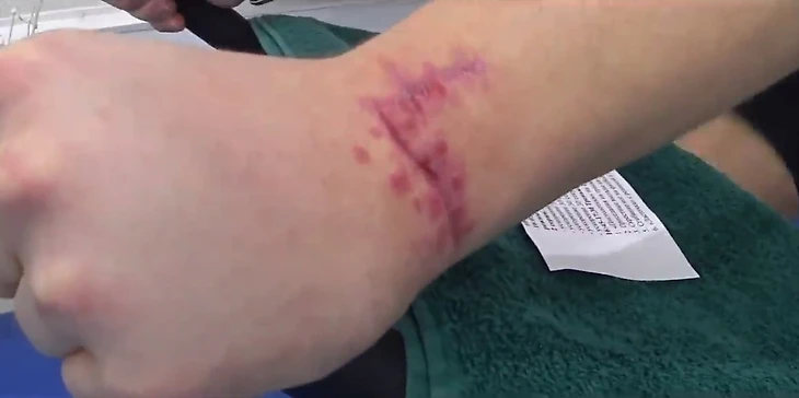 «Напали во дворе, здесь на базе, ха-ха! Да коньком попали во время матча. Оперировали – связки, сухожилия. Все разрезало».