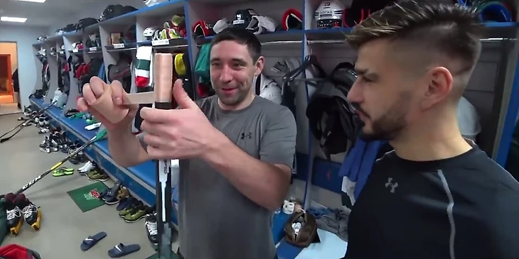 «Вот тут сверху такой своеобразный набалдашник. Мне нравится, когда он немножко мягкий, – премудрости тейпирования клюшки от одного из ветеранов КХЛ. – Лет 10 уже так делаю. Один раз вышел забил и пошло. Мы же спортсмены такие, суеверные».