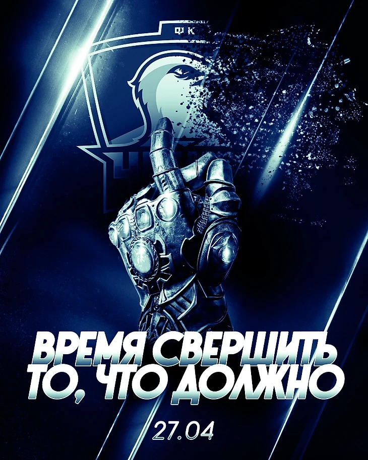 Решили так: раз противник у нас Мстители, то мы, как оппоненты, должны выбрать образ Таноса, ну и главное оружие Таноса – щелчок перчаткой (ну и вратарю команды), который расщепляет противника напополам (поэтому и лого всего часть). Подкрепили это все цитатой из фильма и получили такую афишу.